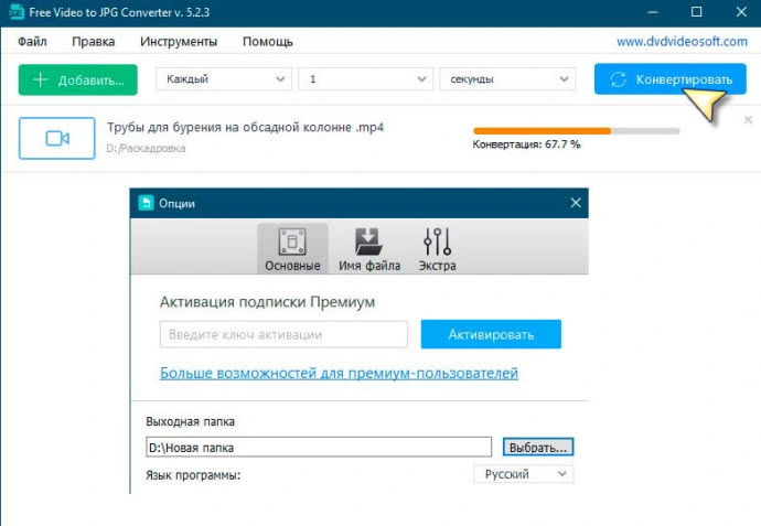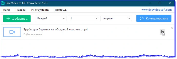 Открываем конвертер и нажав кнопку "Добавить" загружаем в него видеоролик. Затем нажимаем кнопку "Конвертировать". И наблюдаем индикатор процесса разделения ролика на кадры:
